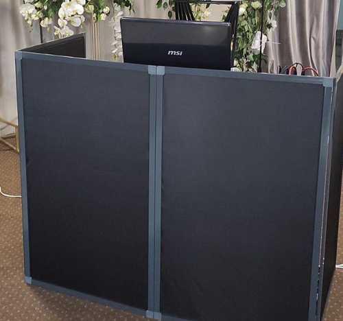 Диджейский фасад (DJ Fasad) - мобильная ширма для диджея черного цвета. Фасад устанавливается перед столом диджея или звукорежиссера и выполняет сразу две функции - закрывает от глаз гостей DJ-оборудование и коммутацию, а также создает неповторимый стиль. Модель состоит из одинаковых прямоугольных окон высотой 110 см и шириной 60 см.