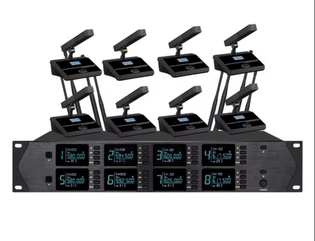 Аренда конференционной системы. Радиосистема состоит из - 8 настольных радиомикрофонов передатчиков и микрофонной базы приемника и предназначается для обеспечения высококачественной связи во время проведения конференций, семинаров, выступления спикеров с трибуны или проведения бизнес совещаний.